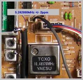 The basis of the exciter is a Yaesu FT840 fitted with +/-2ppm TCXO-4. The standard FT840 circuitry provides a filtered 5.242880MHz reference signal (derived internally from the 10.485760MHz TCXO-4 frequency by a divide-by-two circuit). This fixed frequency signal is brought out externally by adding a flying coaxial cable connection routed through an existing cutout in the FT840 back panel.