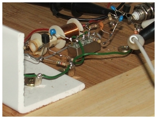 Circuit construction consists of attaching the solder tags in appropriate mounting positions via the wood screws onto the breadboard and then soldering components onto these solder tags. No drilling was required except for the large holes in the plastic L-shaped stock for the input/output connectors. Screwing the plastic L-shaped stock to the bamboo breadboard did not require drilling a pilot hole as the wood screws are self-tappers. The same applies to attaching the solder tags.