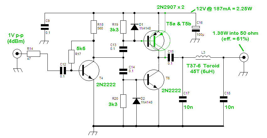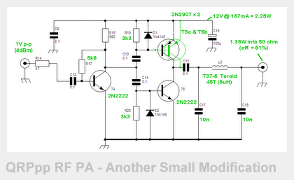 The original circuit had two buffer/driver transistors. The gain of this arrangement meant that only about 25mV p-p was required to drive the TX to its full output of 1400mW. Inputting more than this caused DC shifts which reduced the output level by shifting the duty-cycle away from the optimum 50%. Setting a 25mV p-p level output from the SG1002 DDS was a tricky business as that miniscule level is right at the bottom of the DDS output level pot slider range and it was difficult to hit the drive-level 'sweetspot'.